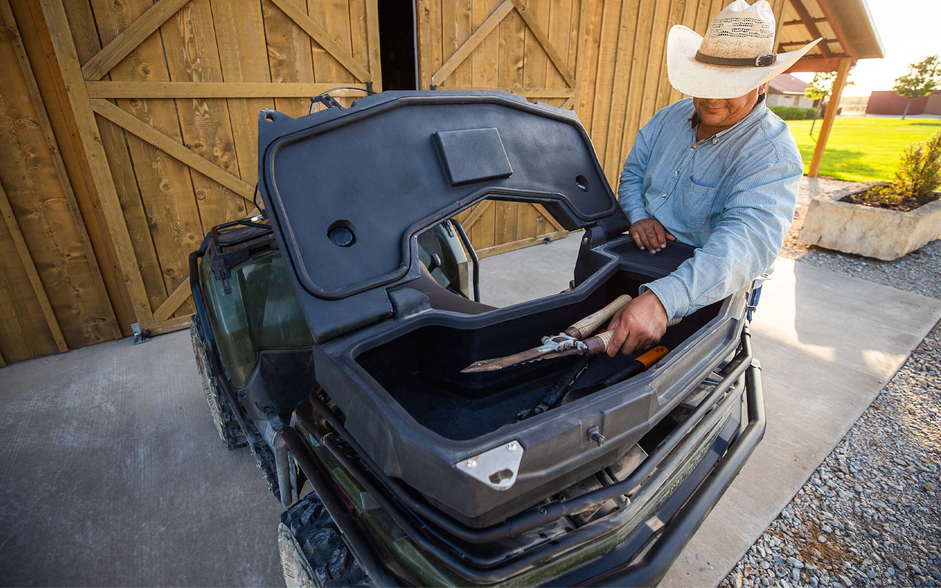 - Armazenamento seco dianteiro compatível com Lock & Ride, 5 gal (18,9 L), armazenamento traseiro